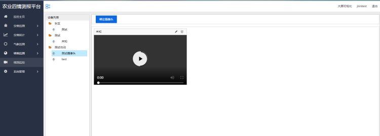 監(jiān)控主頁顯示設(shè)備列表、大屏可視化、地圖展示等菜單信息。顯示土壤墑情、蟲情、氣象監(jiān)測圖標(biāo)及設(shè)備的運行狀態(tài)。
